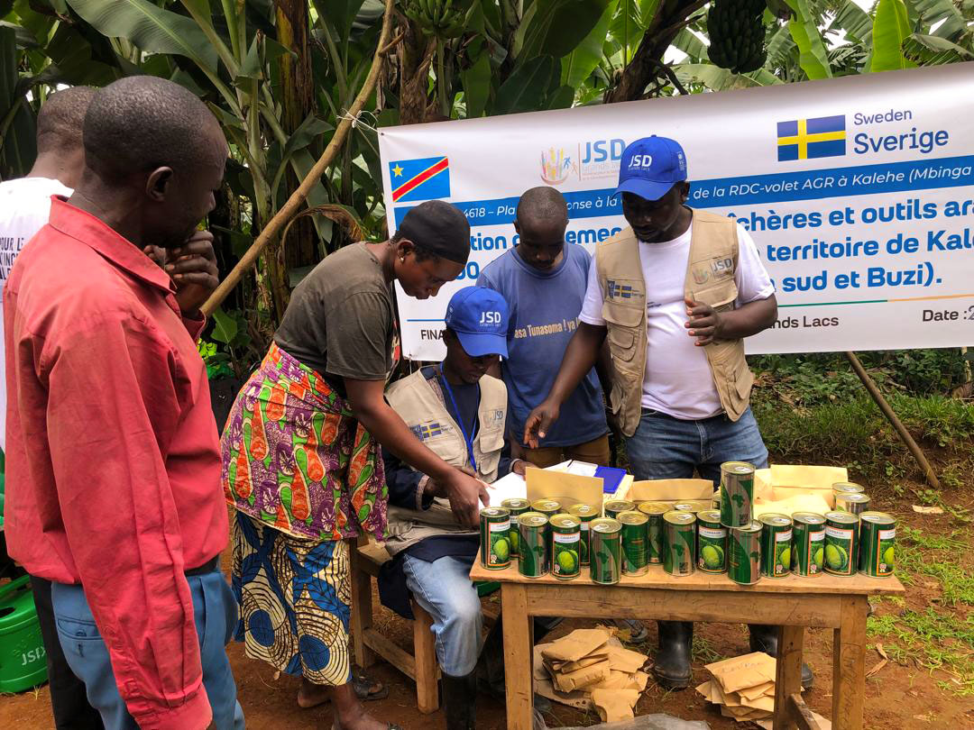 Dans le cadre du projet « appui au relèvement précoce et renforcement de la résilience des personnes déplacées internes, les retournés et les communautés d’accueil dans les groupements de Buzi et Mbinga Sud en Territoire de Kalehe au Sud-Kivu à travers la mise en place des activités génératrices de revenus (AGR) », mis en œuvre avec l’appui du Programme des Nations Unies pour le développement (PNUD) à travers le fond de la Suède, JSD Grands Lacs a procédé à la distribution de semences maraîchères et d’outils aratoires dans le territoire de Kalehe, précisément dans les groupements de Mbinga Sud et Buzi.